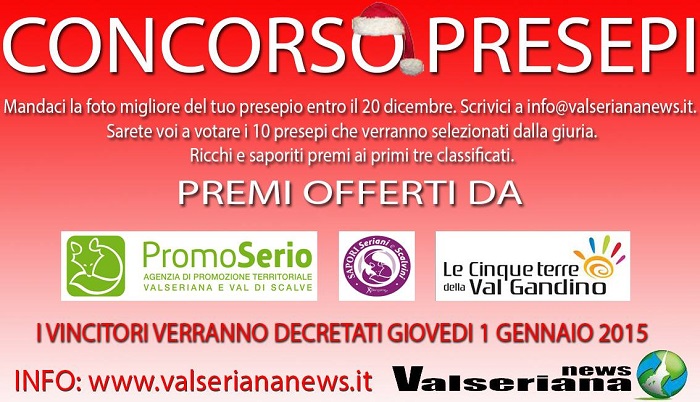 Da oggi fino al 31 dicembre sono aperte le votazioni per il 1° Concorso Presepi di Valseriana News: votare è molto semplice, basta raggiungere la sezione concorso presepi (in homepage si trova in “curiosità”), scorrere tutta la pagina e cliccare sopra il nome del presepe che vi piace di più; ogni click corrisponde ad una visualizzazione e potete cliccare illimitatamente. Verranno premiati con prodotti enogatronomici offerti da Promoserio e Le Cinque Terre della Valgandino, i primi tre presepi che avranno avuto più visualizzazioni.