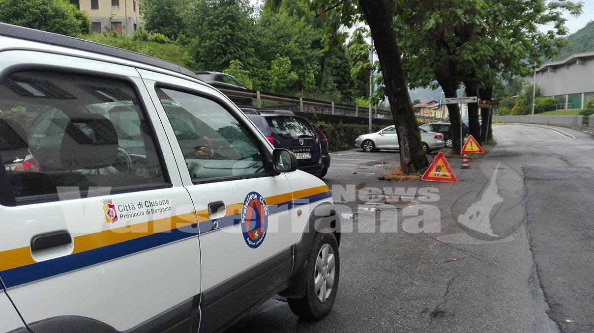 Intervento dei volontari della Protezione Civile e dei Vigili del Fuoco questa sera a Clusone per una pianta pericolante all’imbocco del centro storico.