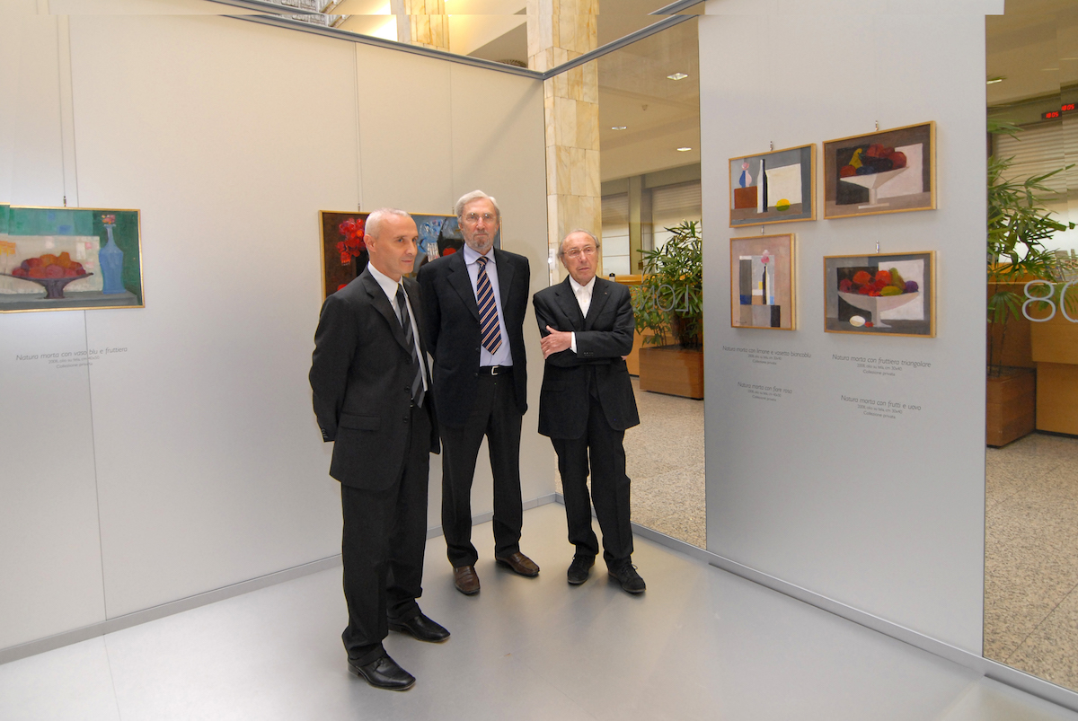 Ricordo con emozione il gesto di sorridente plauso con cui, alla vigilia dell’inaugurazione, il prof. Longaretti – rimirando, dall’alto del Loggiato, le sue opere appese tra le colonne del Salone – manifestò, con un festoso batter di mani, il suo apprezzamento per un allestimento che lo sorprese e lo commosse al punto da menzionare la mia persona, nella sua dedica autografa al catalogo, come autore della mostra (alle mie rimostranze replicò di essere semplicemente autore dei dipinti).