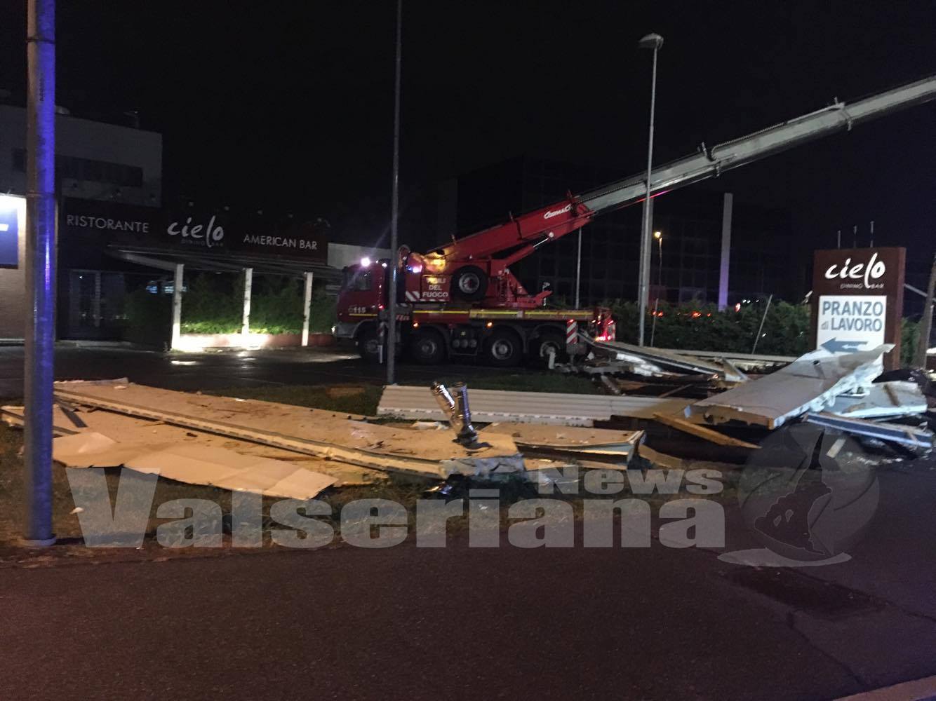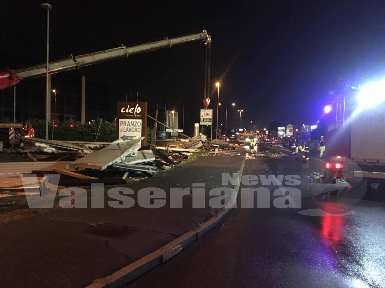 Il tutto si è verificato intorno alle 21 in via Provinciale nella zona commerciale: il tetto è caduto lungo la strada statale 525, che è stata momentaneamente chiusa al traffico.