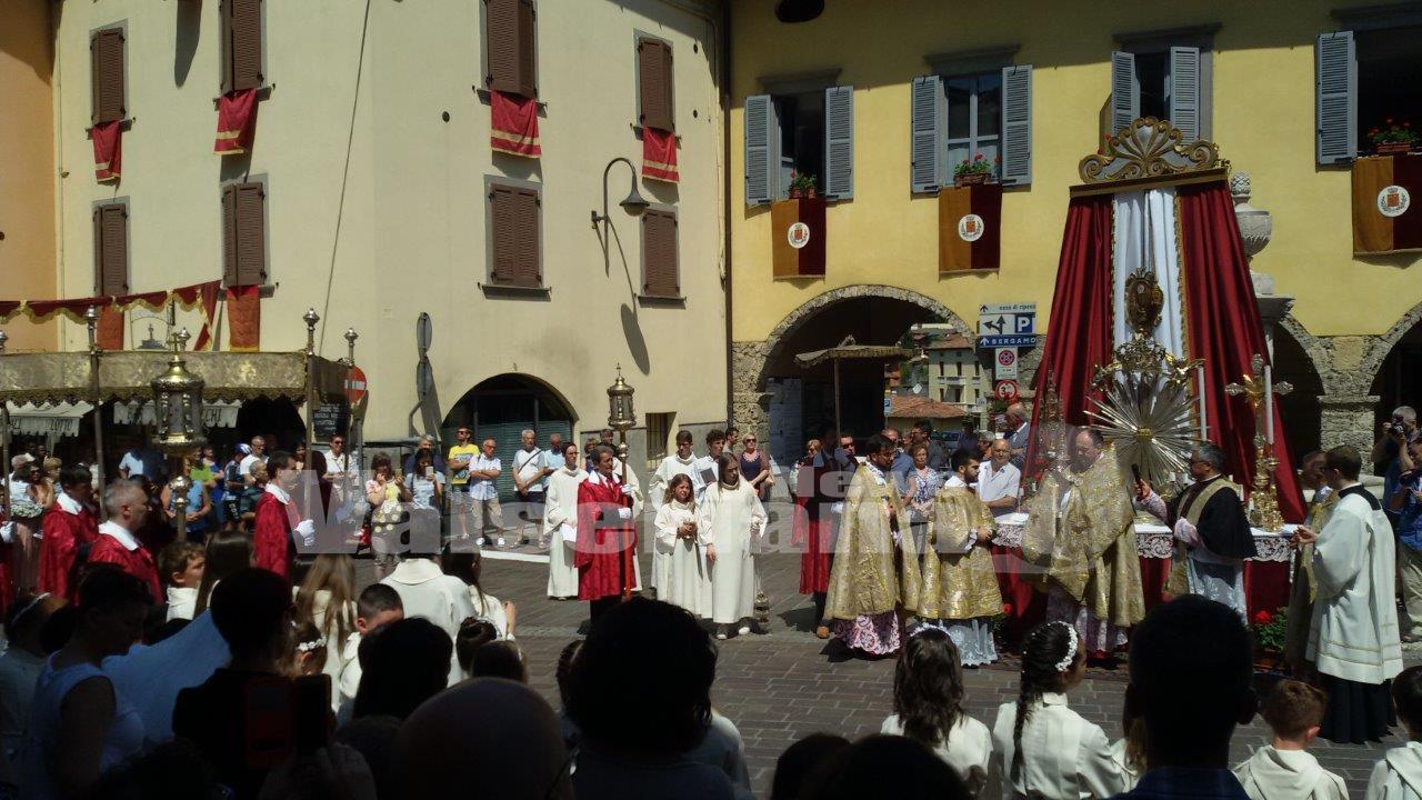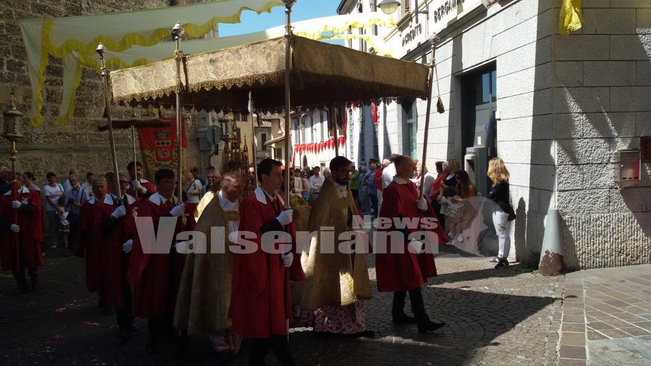 La messa e la processione sono state presiedute da don Gustavo Bergamelli, rettore delSeminario di Bergamo, affiancato dal prevosto don Innocente Chiodi, dal vicario don Giovanni Mongodi e dal curato don Marco Giganti. “Il ritrovo alla mensa eucaristica e la processione – ha sottolineato don Bergamelli nell’omelia in Basilica – sono segni cocnreti della volontà di condividere la fede cristiana e della necessità di essere noi stessi tabernacoli di Gesù Eucarestia sulle strade del mondo, anche nella nostra quotidianità. Un’urgenza di dialogo che in famiglia e nella comunità esprime la necessità di rimettere al centro i valori di speranza e carità del nostro essere cristiani”.