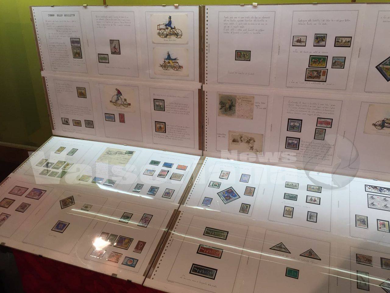 Esposti francobolli tematici sulle nascita e sulla storia della bicicletta di Rottigni Secondo; fogli interi di francobolli emessi in particolari ricorrenze legate al tema del ciclismo di Ghilardi Federico e altre curiosità sulla bicicletta insieme al tutte le figurine dello speciale album Panini realizzato in occasione dei 100 anni del Giro d’Italia di Leonardo Spampatti, presidente del Gruppo filatelico Valgandino.