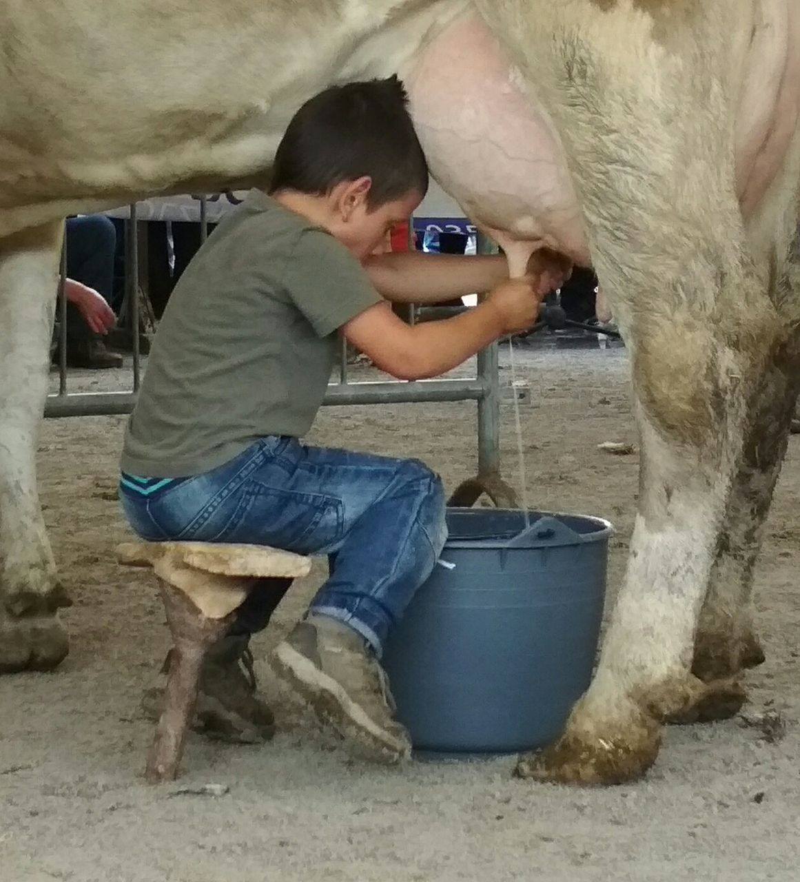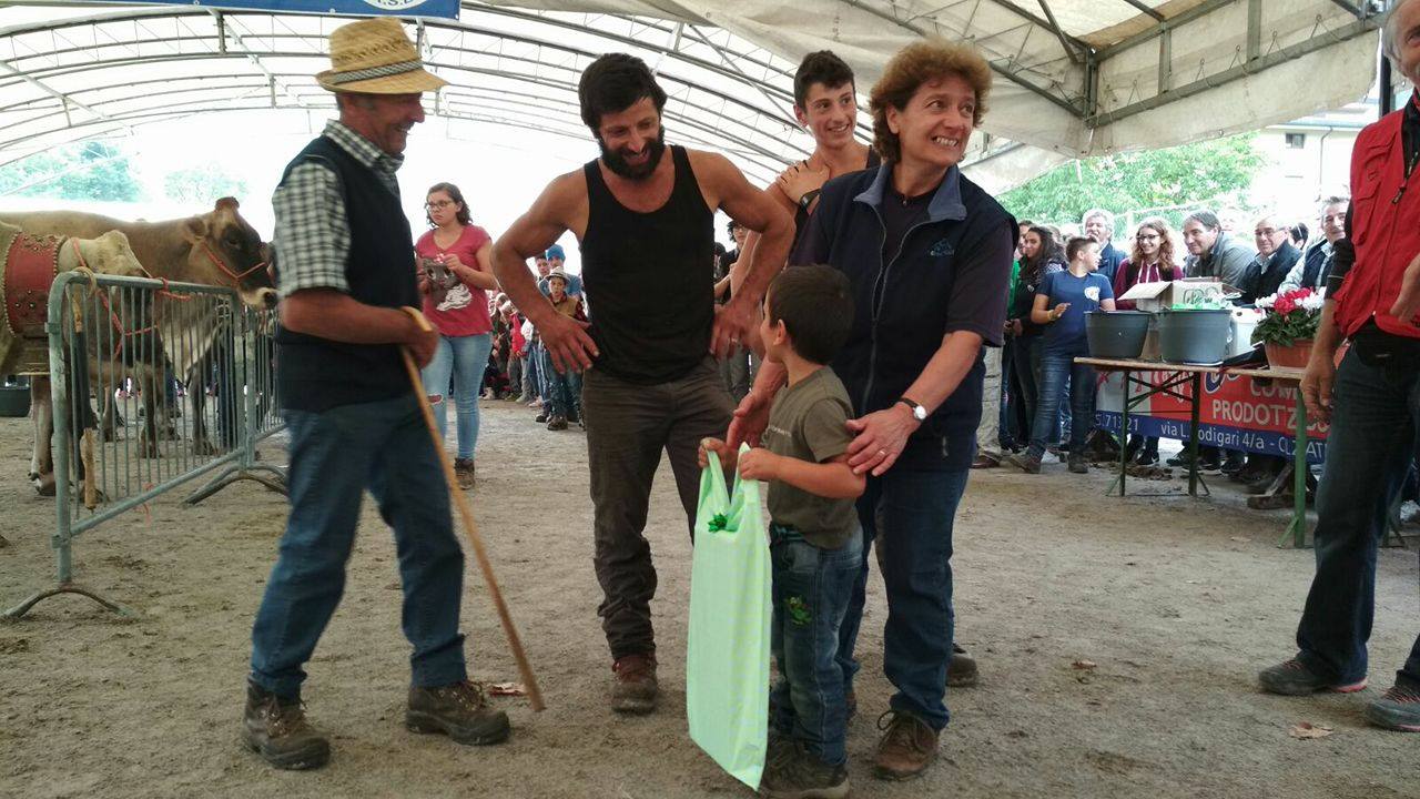 Giulio Beccarelli e il piccolo Mirko di 5 anni vincolo la gara di mungitura alla Fiera Zootecnica di Clusone. 11 kg munti in 3 minuti dal papà, 2,5 kg dal bimbo.