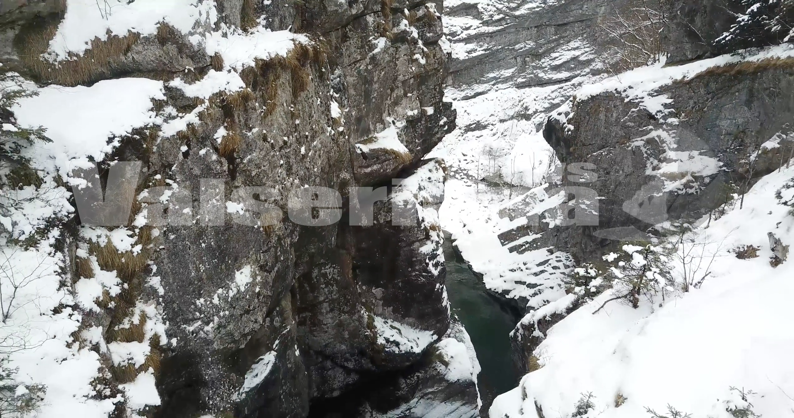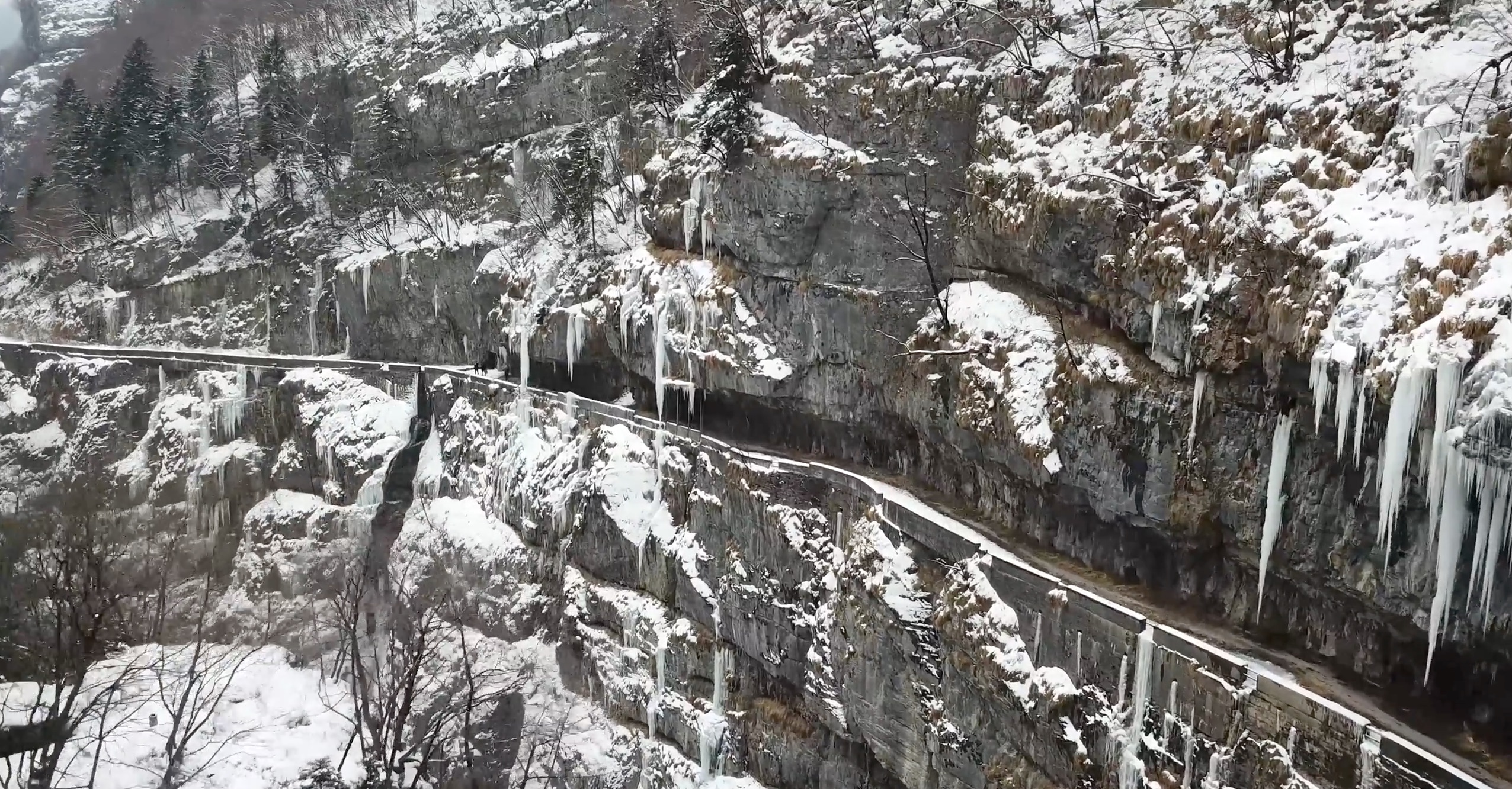 Gli orridi della Via Mala in Val di Scalve, ripresi dall’occhio del drone durante il gelido inverno.