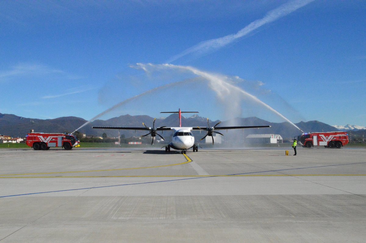 Ad accogliere l’ATR-72 di Aeroitalia, salutato all’arrivo dall’arco d’acqua del Distaccamento Vigili del Fuoco di Orio al Serio, il vicepresidente di SACBO, Fabio Bombardieri, l’assessore alle infrastrutture di Regione Lombardia, Claudia Maria Terzi, e Giacomo Cattaneo, direttore commerciale aviation di SACBO.