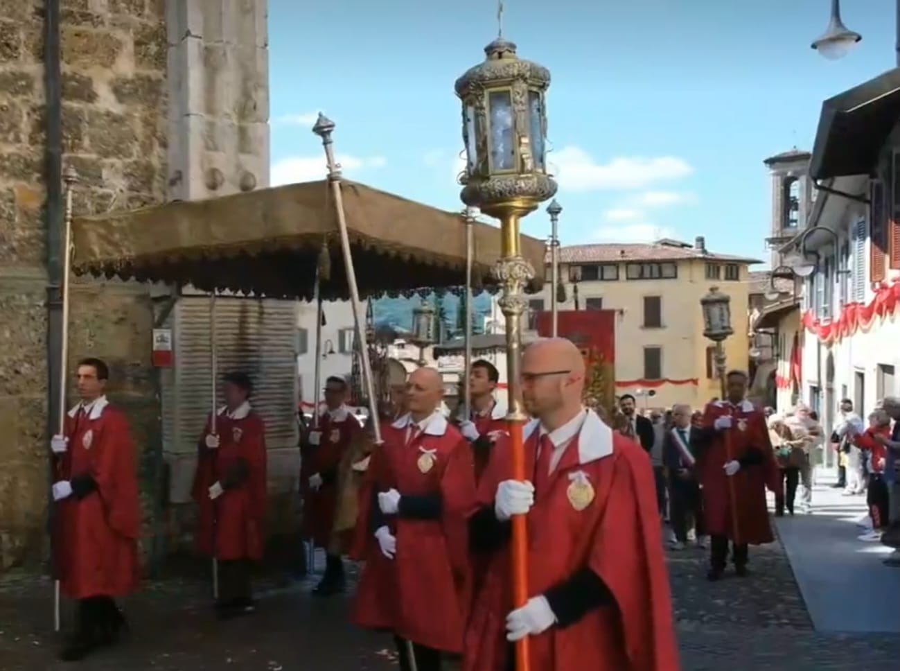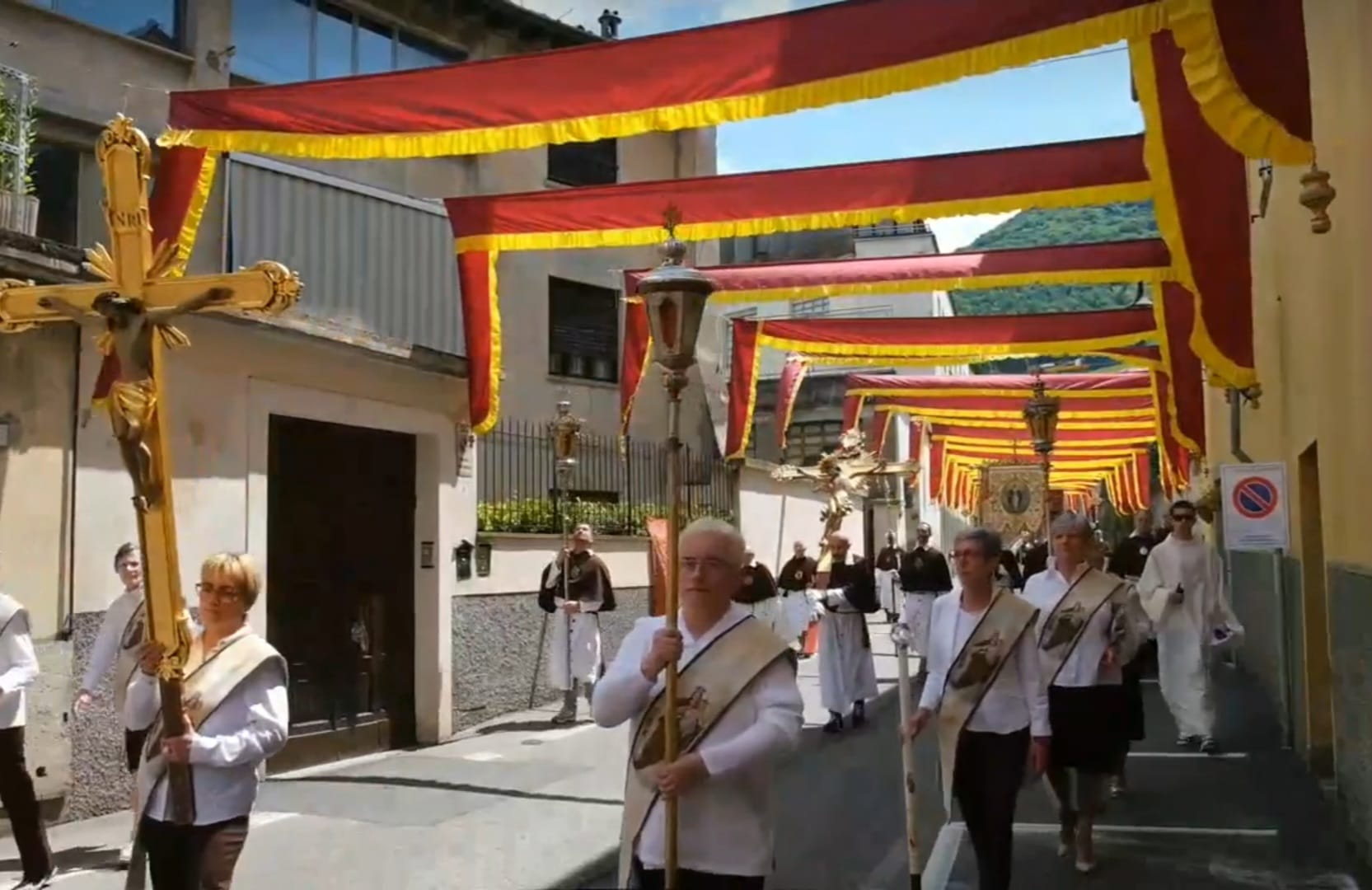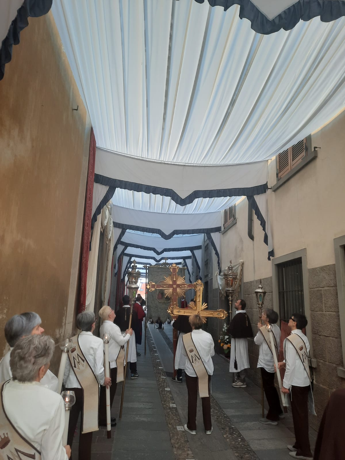 Lunghissima la teoria di Confratelli, volontari dei gruppi parrocchiali, ragazzi dei sacramenti, paggetti, piccoli angeli e autorità, guidate dal sindaco Filippo Servalli e dal comandante della Polizia Locale, Enrico Badon. Importante novità il ripristino, fra via Noris e le Quattro Vie (quartiere di Cima Gandino), della storica galleria che un tempo, grazie ai pannilana donati dalle industrie, costituiva l’intero percorso della processione. Una tradizione andata dispersa con la Seconda Guerra Mondiale ed ora ripristinata per un tratto di un centinaio di metri grazie all’alacre lavoro della Confraternita del Carmine, guidata dal priore Silvio Tomasini.