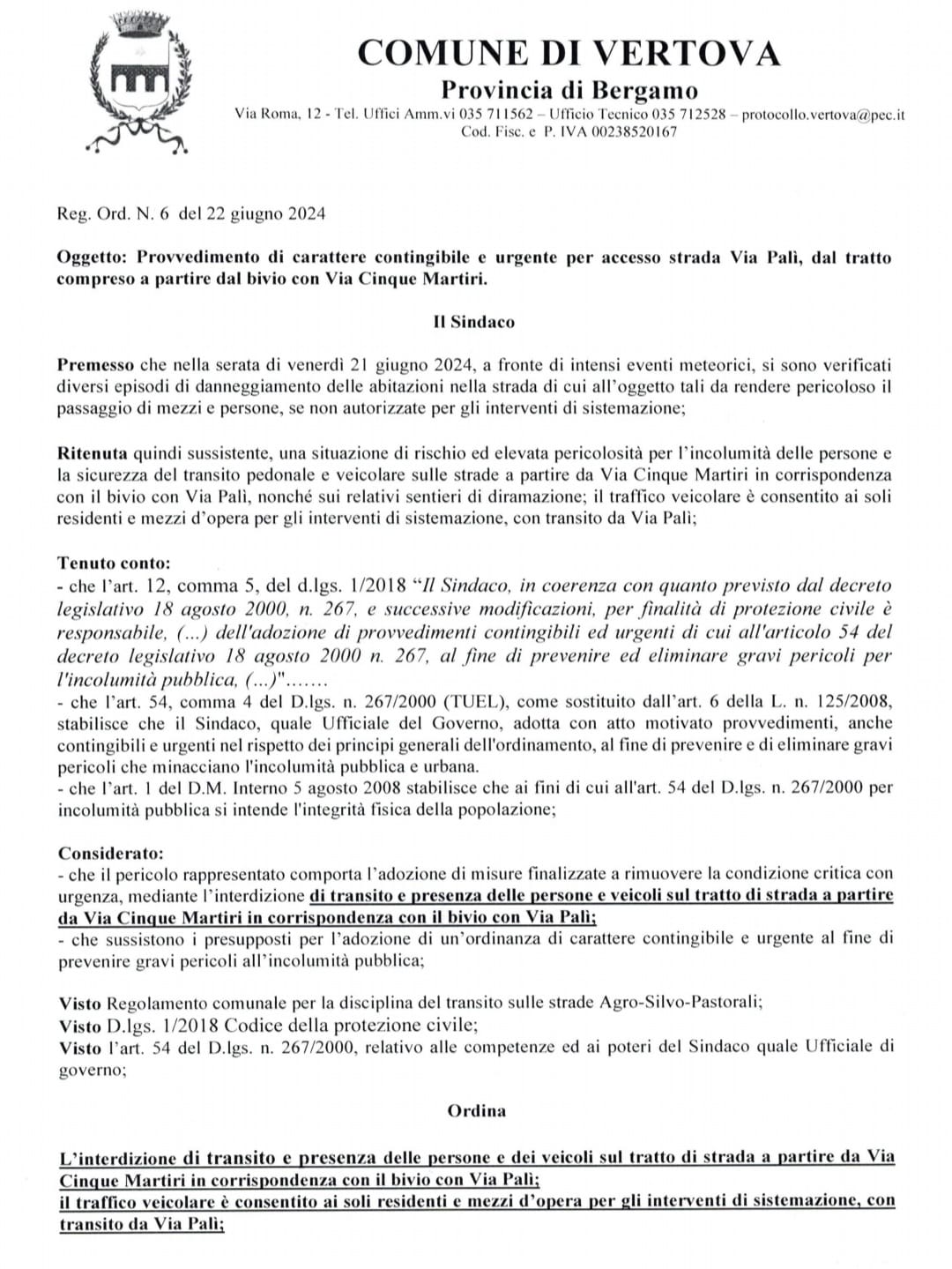 A tal proposito il Sindaco ha emesso un’ordinanza che prevede la chiusura della strada di via Palì dal tratto compreso a partire dal bivio con via V Martiri. Seguiranno aggiornamenti non appena l’emergenza sarà rientrata e la strada totalmente sgomberata e messa in sicurezza. Segue l’ordinanza nel dettaglio.