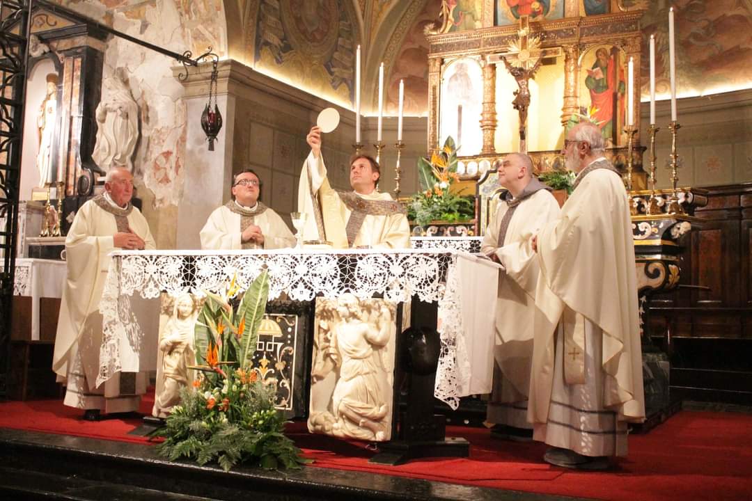 Al termine della messa celebrata a Ponte Nossa (con al suo fianco fra gli altri l’amministratore parrocchiale di Premolo don Marco Perletti e mons. Giuliano Borlini, arciprete di Clusone) don Angioletti ha pregato davanti all’affresco della miracolosa lacrimazione e deposto sull’altare il pallio da Buon Pastore ricevuto nel 2015 nel giorno del suo ingresso in parrocchia, lasciandolo a disposizione del suo successore.
