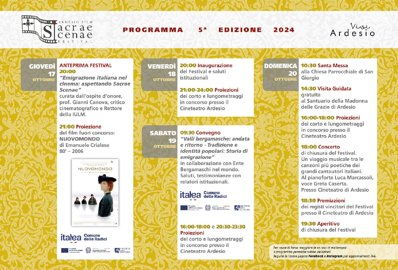 L’evento prenderà il via giovedì sera alle 20 nel cineteatro con l’anteprima del festival, la serata dedicata alle grandi pellicole con il professor Gianni Canova «L’emigrazione italiana nel cinema – Aspettando Sacrae Scenae» cui seguirà la proiezione del film fuori concorso “Nuovomondo” di Crialese. Il festival entrerà nel vivo venerdì nel Cineteatro con l’inaugurazione (20:00) e poi le proiezioni dei film in concorso dalle 21 alle 24. Sabato il secondo evento di approfondimento alle 9.30 con il Convegno «Valli Bergamasche andata e ritorno. Tradizioni e identità popolari. Storia di emigrazione» con l’Ente Bergamaschi nel Mondo.