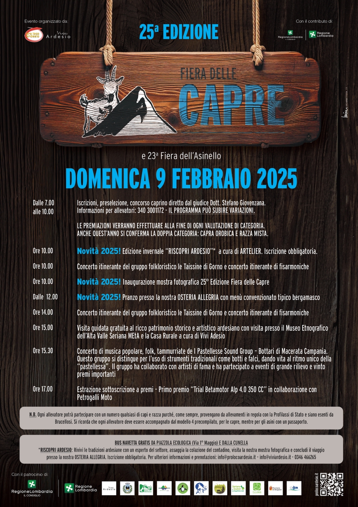 L’evento, organizzato dalla Pro Loco Ardesio in collaborazione con l’amministrazione comunale e con il contributo di enti e sponsor. Protagonisti del weekend ad Ardesio saranno quindi capre, becchi, asinelli con gli allevatori di montagna, di professione e hobbisti, che si ritroveranno nel borgo orobico per il tradizionale appuntamento che sarà anticipato sabato sera (8 febbraio) dal convegno “Vivere in Montagna: protagonisti!” con focus sulla Natura e i cambiamenti.
