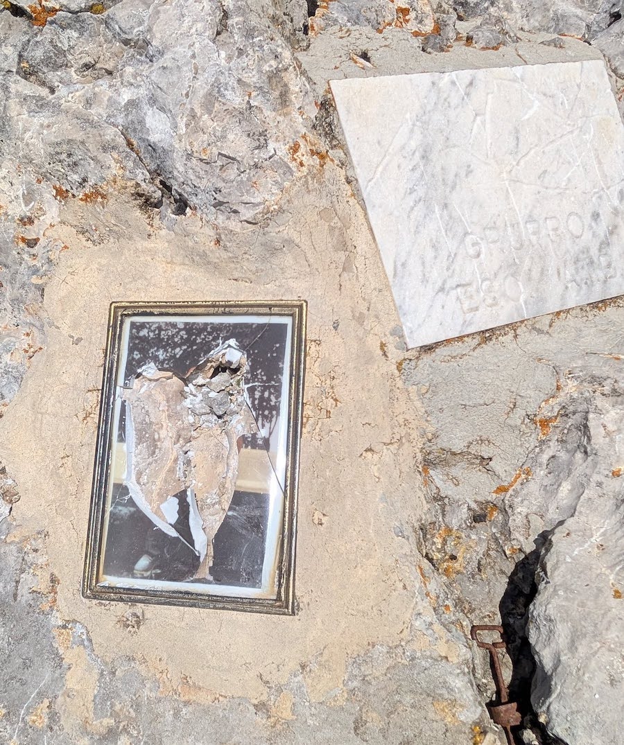 Poco distante dalla croce, Fabio nota una foto commemorativa a terra, presumibilmente portata in vetta da qualcuno in memoria di un caro. Qualche passo più avanti, incontra quattro giovani che stanno raccogliendo altre foto sparse tra le rocce. Insieme fanno una triste scoperta: una fotografia in ceramica, da anni presente sulla vetta, è stata distrutta a sassate. Anche il volto scolpito e dipinto di Gesù, seppur sbiadito dal tempo, è stato intenzionalmente colpito e deturpato.