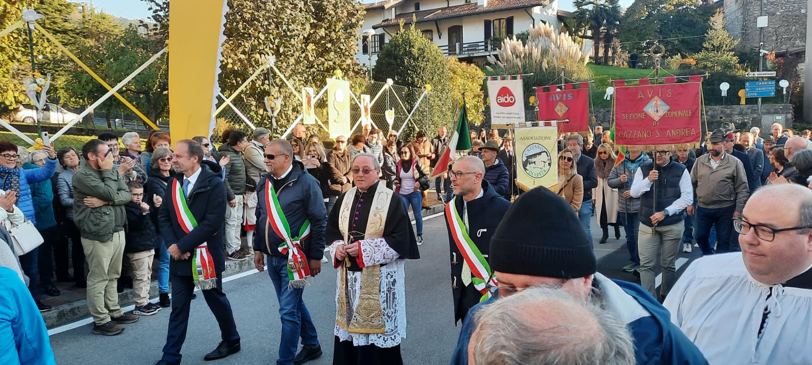 Un benvenuto caloroso, ricco di reciproca emozione e trepidante attesa. Nel pomeriggio di domenica 26 ottobre la comunità di Cazzano S.Andrea ha dato il benvenuto al nuovo parroco don Elio Mistri. Ad accoglierlo come tradizione presso il ponte di via Papa Giovanni c’era il paese intero, rappresentato dal sindaco Sergio Spampatti, dai vessili di tutte le associazioni, da bambjni, docenti e famiglie della Scuola Materna parrocchiale, dai giovani dell’Oratorio e da tantissimi fedeli. A salutare don Elio anche il sindaco di Vertova, suo paese natale, Riccardo Cagnoni e quello di Torre de Roveri, dove è stato parroco per ben 27 anni.