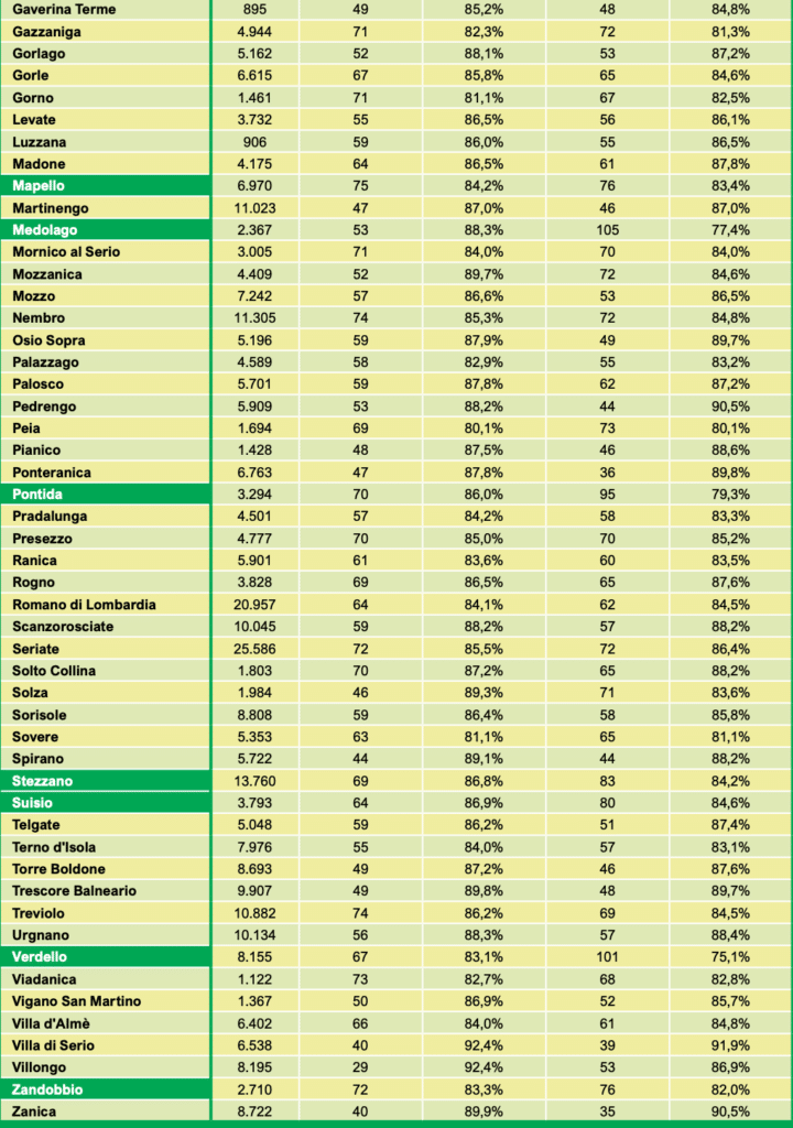 I nuovi Comuni della Val Seriana sono Fiorano al Serio e Colzate, questi si aggiungono ai comuni che da anni rientrano nel report: Albino, Alzano Lombardo, Gazzaniga, Gorno, Nembro, Peia, Pradalunga, Ranica e Villa di Serio. Qui di seguito tutti i comuni della provincia di Bergamo con i dati.