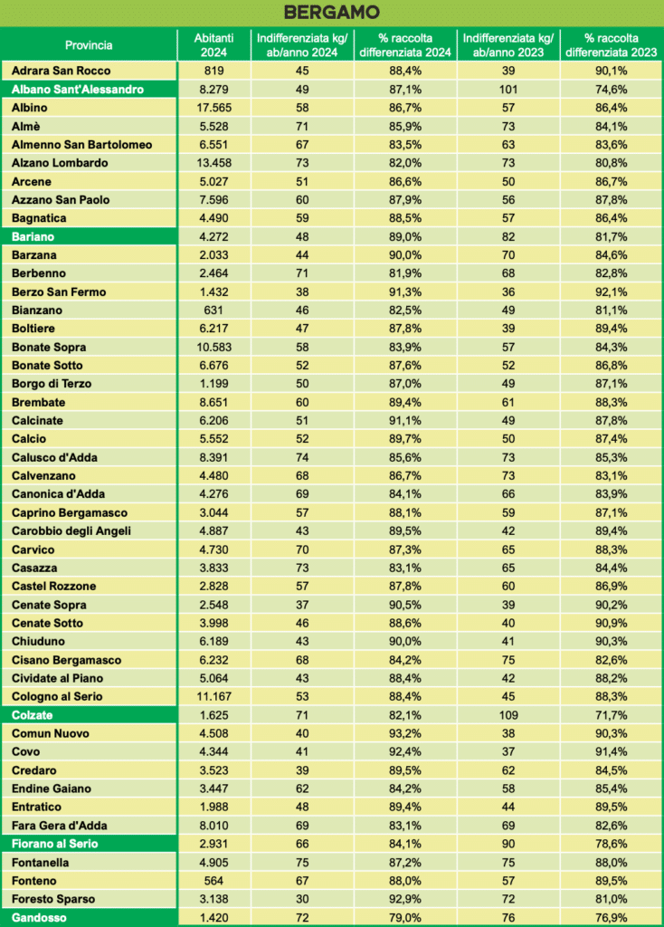 Le provincie di Bergamo e di Mantova fanno registrare le più alte percentuali di raccolta differenziata, rispettivamente del 81,4% e del 87,4%, al di sopra dell’80% da raggiungere entro il 2027 secondo il Piano Regionale per la Gestione dei Rifiuti in vigore come “scenario obiettivo”, già superato da cinquecento novantasette comuni (pari al 40% del totale) addirittura oltre l’83%, indicato come “scenario ottimizzato” dallo stesso PRGR, più sfidante, e che dovrebbe tendere a essere il vero valore di riferimento a livello regionale. Le province di Cremona, Mantova e Monza Brianza non hanno comuni al di sotto del 65% di raccolta differenziata. La Lombardia vanta un’importante dotazione impiantistica sia di termovalorizzazione sia di recupero delle materie prime seconde, che si traduce in meno dell’1% di rifiuti avviata in discarica. I numerosi termovalorizzatori e impianti di incenerimento e coincenerimento presenti nel territorio, sono costretti ad importare rifiuti anche urbani da fuori regione.