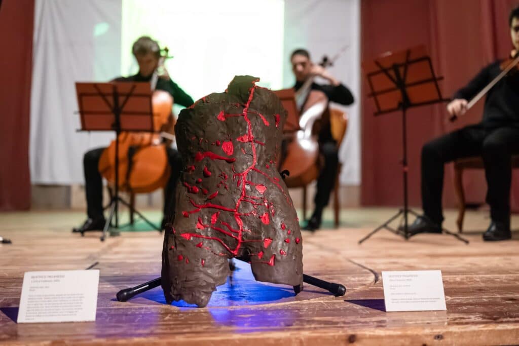 La ceramica, materiale antico e profondamente legato al gesto, viene utilizzata da Paganessi come veicolo espressivo dell’interiorità: una materia viva, capace di trattenere tracce, imperfezioni e segni del processo creativo. In questo modo, la superficie scultorea diventa pelle, confine poroso tra esterno e interno, tra ciò che è visibile e ciò che resta nascosto. L’allestimento all’interno dello storico spazio teatrale casnighese amplifica ulteriormente la dimensione esperienziale della mostra.