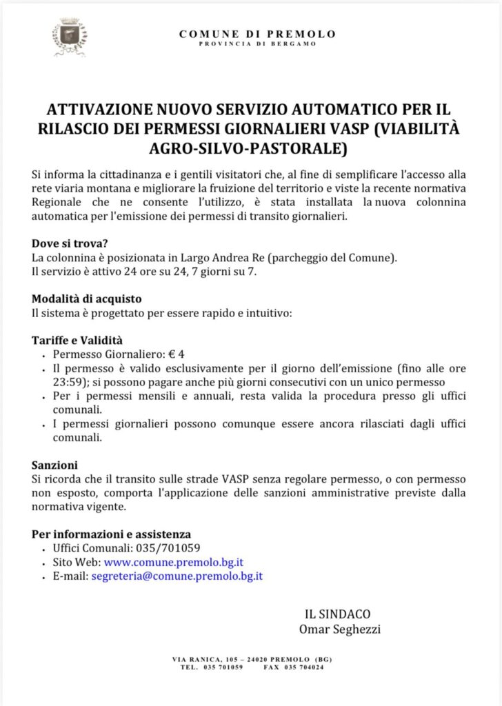Il Comune di Premolo ha attivato un nuovo servizio automatico per il rilascio dei permessi giornalieri VASP (Viabilità Agro-Silvo-Pastorale). L’iniziativa nasce con l’obiettivo di semplificare l’accesso alla rete viaria montana e migliorare la fruizione del territorio, in linea con la recente normativa regionale che ne consente l’utilizzo.