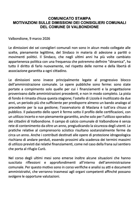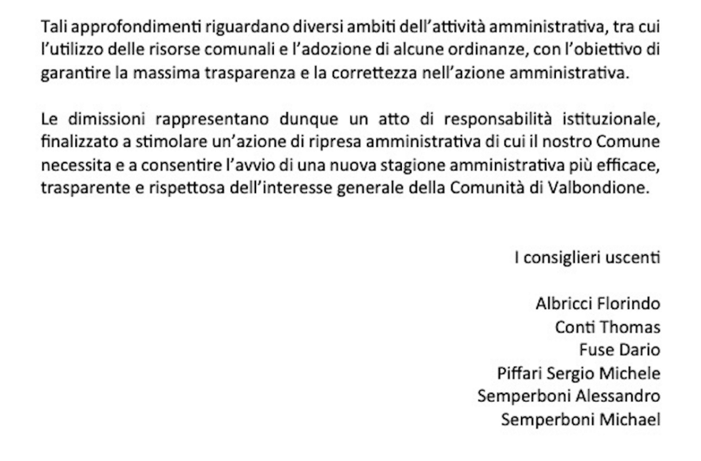 Le motivazioni delle dimissioni dei consiglieri di Valbondione