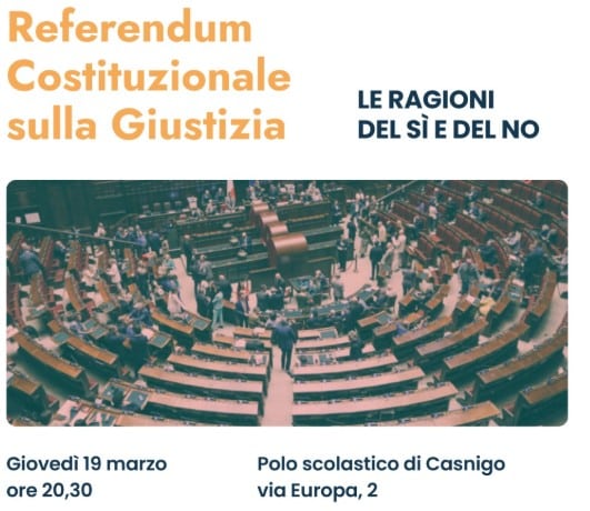 Giovedì 19 marzo, alle ore 20:30, si terrà a Casnigo un incontro informativo dedicato al Referendum Costituzionale previsto per il 22 e 23 marzo. L’evento si svolgerà presso il Polo scolastico in via Europa 2 e rappresenta un’importante occasione per approfondire i contenuti della consultazione elettorale e comprendere le diverse posizioni in campo.