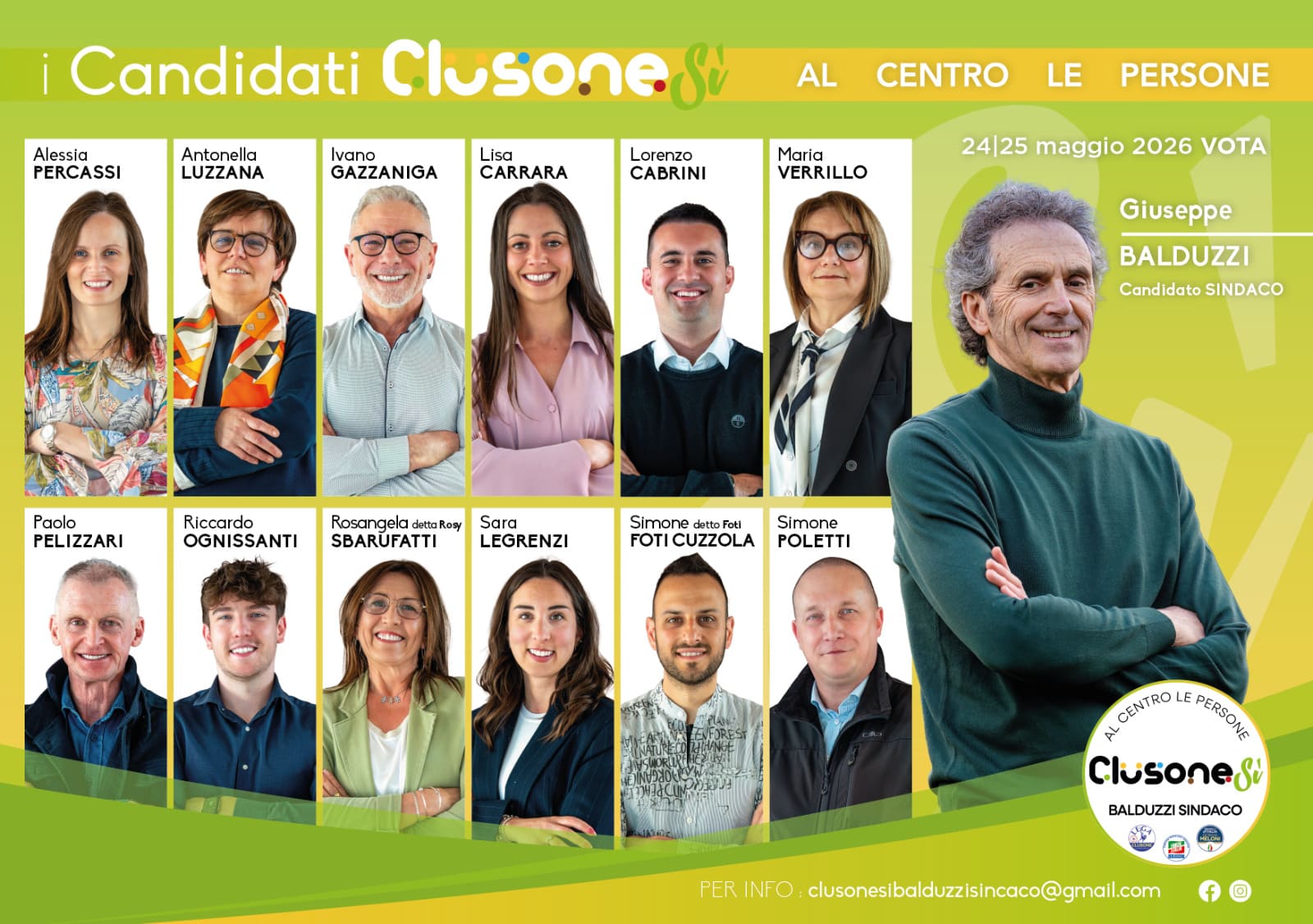 Come riportato dal comunicato ufficiale: “ClusoneSì” si fonda su una visione chiara: una città più vicina alle persone, con una gestione pubblica più attenta, trasparente e orientata ai risultati e con l’ambizione di rafforzare il ruolo di Clusone come punto di riferimento per l’Alta Valle Seriana e per l’altopiano. Si tratta di una squadra composta da cittadini e professionisti profondamente legati alla Città, sostenuti dai partiti del centrodestra e da una componente civica autonoma che ha scelto di riconoscersi nel progetto, contribuendo in modo diretto alla sua definizione. Una squadra che unisce la disponibilità e l’entusiasmo di molti giovani, diversi dei quali alla prima esperienza amministrativa, a figure con competenze ed esperienza.